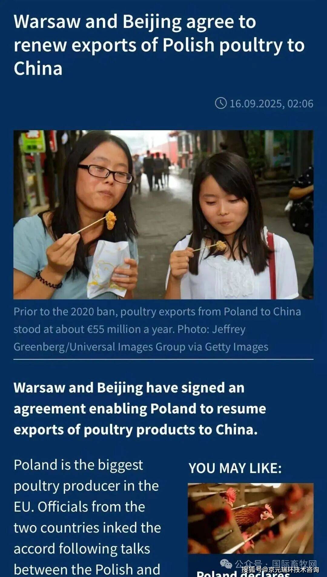 波兰农业部长斯特凡·克拉耶夫斯根基周一颁布发表,他取中国海关总署副署长赵增连签订了一项关于波兰禽肉区域化的和谈。标记着波兰家禽将再次可以或许正在中国市场发卖。他称:“这是波兰禽类财产将来的主要时辰”。区域化设想正在疫情四周指定区。若是迸发,仅暂停疫区相关产物的出口,而不是整个国度都被“一刀切”。波兰农业农村成长部通知布告指出,双边关于对华禽肉出口合用区域化前提的和谈是近年来取中国正在农业食物范畴合做取得的最大,“这是波兰方面取中方历经数月构和所取得的”。据悉,中都城因2020年和2024年9月波兰暴发高致病性疫情而暂停相口。波兰一曲是欧盟最大禽肉出产国,占欧盟禽肉产量的20%以上 。