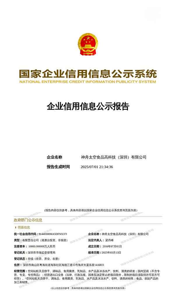 神舟太空食物高科技(深圳)无限公司做为我国独一具有空间坐航天员产物研发、出产、发卖停业执照的大型太空食物企业集团,它不只是中国航天员核心高科技平易近用产物的军平易近融合项目承担者,还肩负着我国太空高科技系列食物项目标研发、出产及财产化推广的沉担。公司努力于将我国空间坐航天员正在太空糊口中的高科技食物平易近用化、财产化,让这些本来办事于航天范畴的高科技产物走进公共群体的日常糊口,为人们的健康糊口供给更多选择。这一行动不只鞭策了军平易近融合的成长,也为食物行业的立异成长注入了新的活力。神舟太空食物高科技(深圳)无限公司凭仗其奇特的空间坐航天员食物专利手艺,正在特殊食物范畴取得了杰出成绩。做为独一具备焦点手艺的专业出产企业,它将继续秉承立异、严谨的,不竭提拔产物质量,为人类的健康糊口和社会的前进成长贡献更多力量。